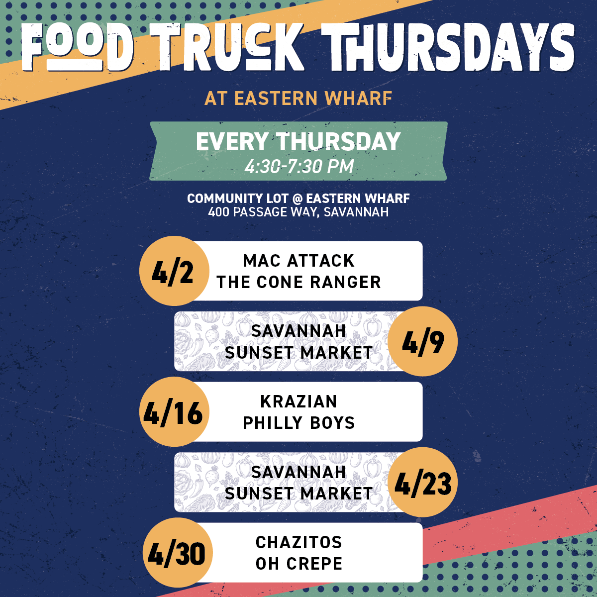April will feature two trucks per week with plans to increase the number of trucks based on demand. The Thursday food truck and Savannah Sunset Market schedule for April is as follows:
